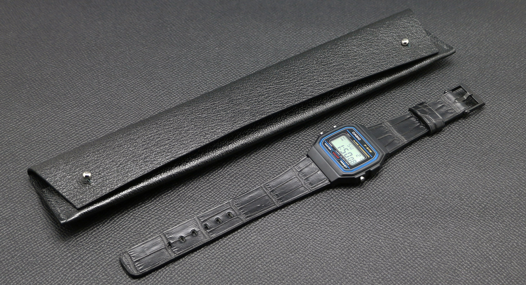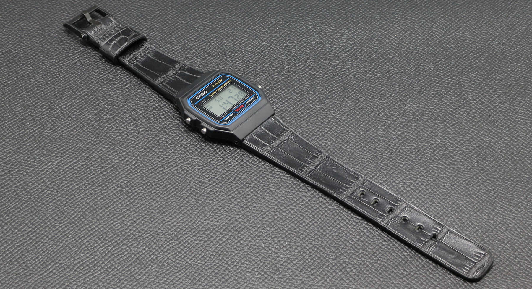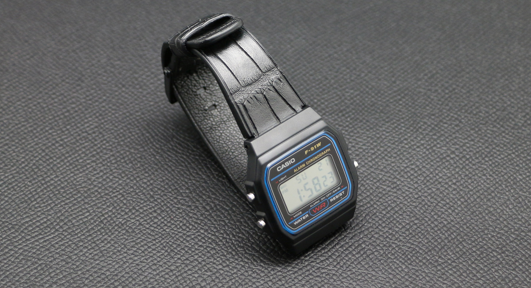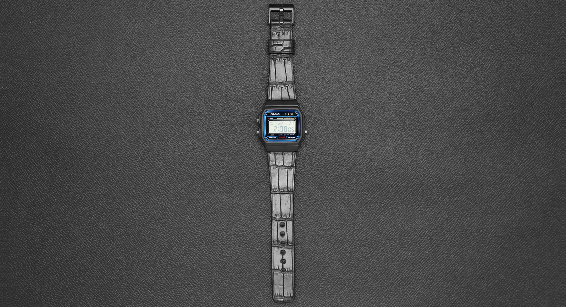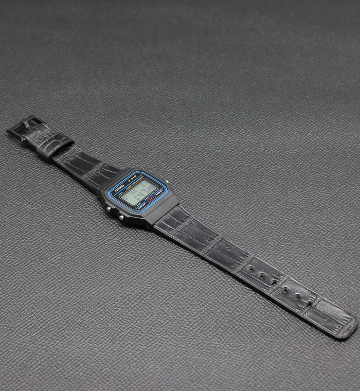 Wear the iconic Casio F-91W watch with an upgraded croco strap.