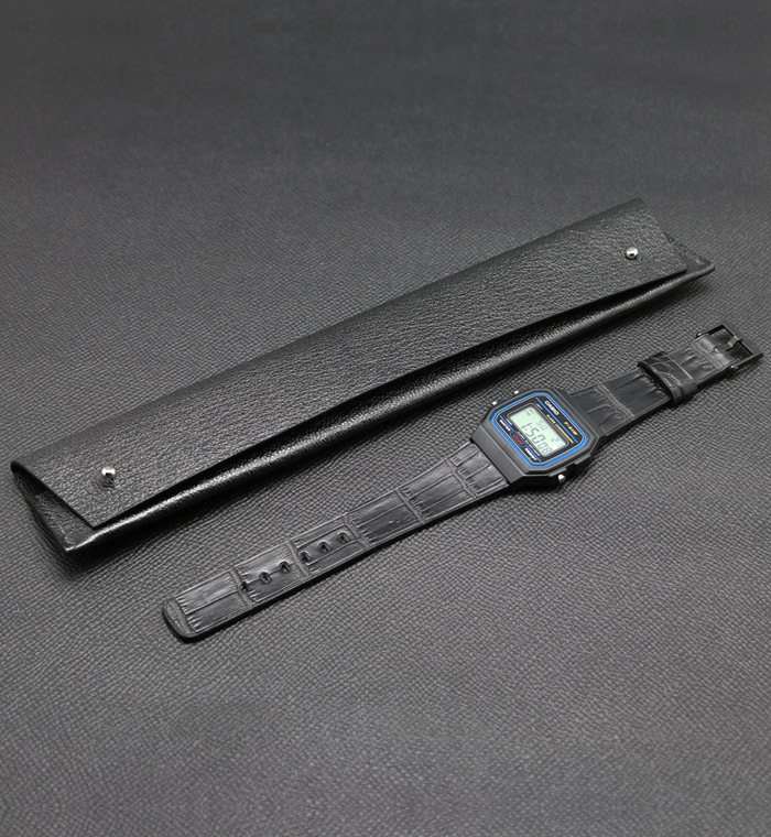 The watch is shipped in a black leather sleeve (made from upcycled leather) and the original Casio F-91W user guide.